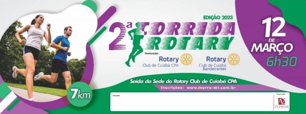 A 2ª. CORRIDA ROTARY é um evento realizado pelo ROTARY CLUB DE CUIABÁ CPA E ROTARY CLUB DE CUIABÁ BANDEIRANTES, com finalidade exclusivamente esportiva e filantrópica.