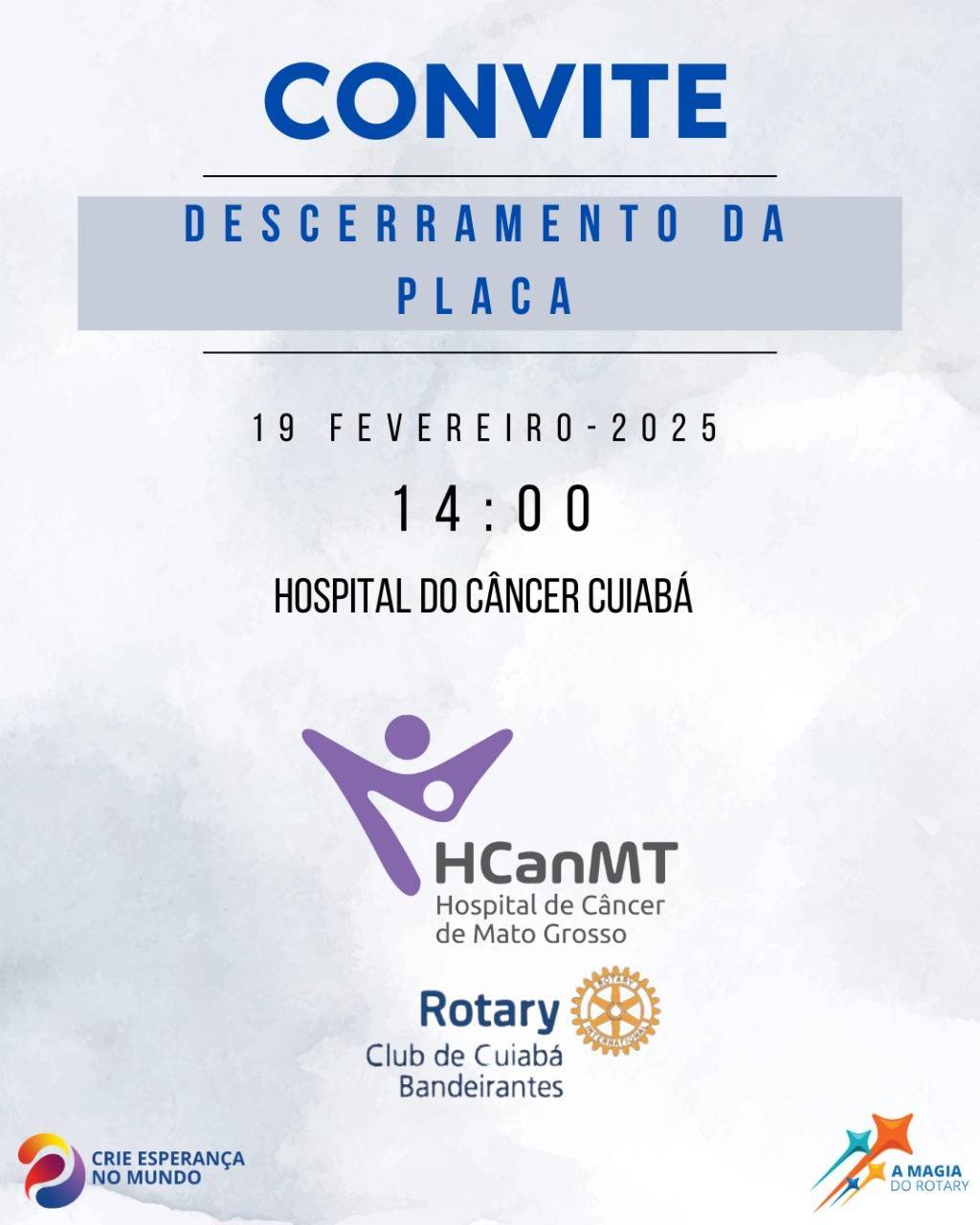 O Rotary Club de Cuiaba Bandeirantes convida para descerramento de placa Alusiva ao Recebimento e implantação de aparelhos no Hospital de Cancer de Mato Grosso.